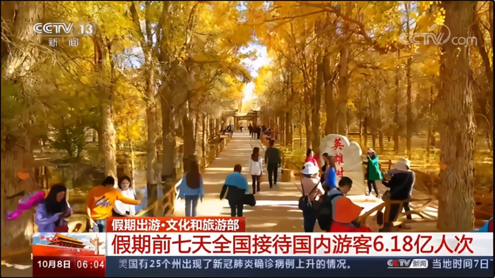 10月8日,据央视新闻消息,今天是国庆假期的最后一天,根据文化和旅游部的数据统计,国庆假期前7天,全国接待国内游客6.18亿人次,实现旅游收入4543.3亿元。