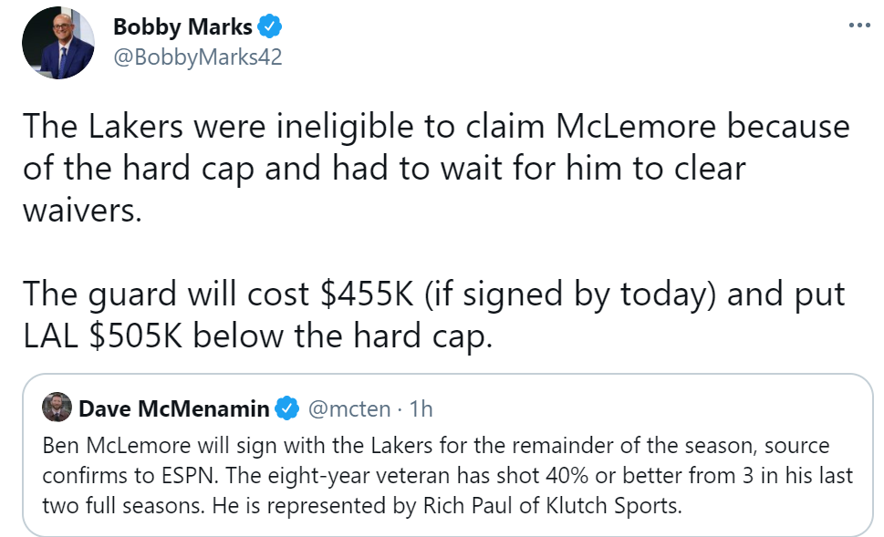 薪金专家鲍比-马克斯表示,由于硬帽的原因,湖人无法直接认领麦克勒莫,因此他们得等待麦克勒莫度过澄清期。如果他们今天签约,麦克勒莫将花掉湖人45.5万美元,这样一来,湖人的总薪金距离硬帽线还有50.5万美元。