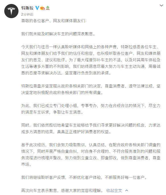 特斯拉发布公告称,已成立专门处理小组,专事专办,努力在合规合法的情况下,尽全力的满足车主诉求,争取让车主满意。