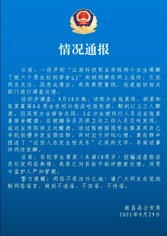 据“昌南公安”微信公众号9月29日通报,日前,一段声称“江西科技职业学院两个女生喝醉了被六个男生拉到宿舍qj”的短视频在网上流传,引发网友关注。获悉此情后,警方高度重视,迅速组织相关部门进行调查处理。