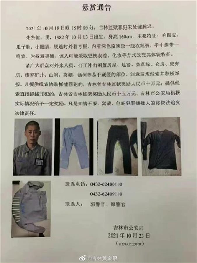 此前,位于吉林市西南方向直线距离约350公里的内蒙古通辽市警方,于10月20日发布协查通告称,朱贤健有较大可能逃窜到邻近的地市。其穿深色夹克,下穿深色裤子,脚穿白色旅游鞋。衣服、鞋子均特别破旧且不得体,衣服鞋帽明显偏大,随身携带一个长约50公分、高约30公分的棕色行李袋。而据吉林监狱此前发布的悬赏通告称,朱贤健逃跑时身穿监狱劳动服,内穿深色线衣线裤,说明他已经换装。