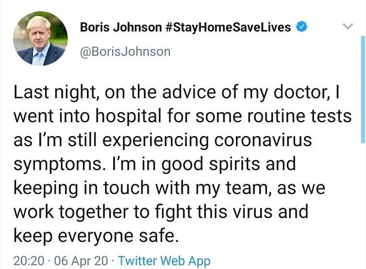 4月5日,由于持续10天出现高烧症状,鲍里斯·约翰逊决定“听从医生团队的建议”入院治疗。进入伦敦圣托马斯医院后,约翰逊在推特上这样描述的自己的状态: