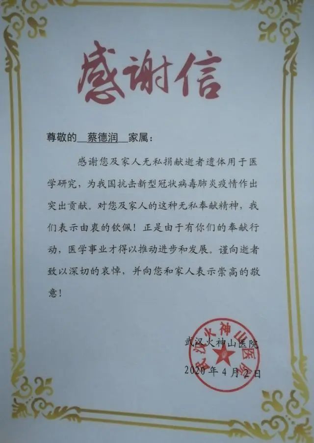 武汉火神山医院的病房陆续空下来,贴上了封条。但70岁的蔡德润永远留在了火神山,确切地说,他身体的一部分留在了这里——他因新冠肺炎抢救无效去世后,家人捐献他的遗体用于研究,帮助世人“认识新冠肺炎的发生发展机理”。