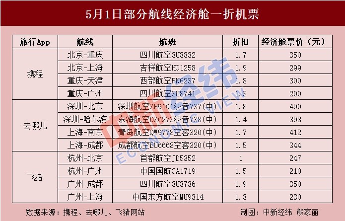 以5月1日出发的经济舱票价为例,杭州到北京的首都航空JD5352次航班票价(机票价格均不含税费及燃油费)低至1折,仅需247元;重庆到广州的四川航空3U8741次航班票价为经济舱全票的1.3折,仅需200元。