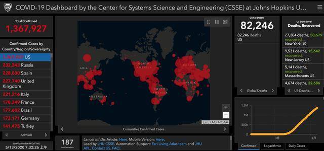 根据美国霍普金斯大学实时数据,截至发稿前,美国累计确诊新冠肺炎病例高达136万,死亡超过8.2万。