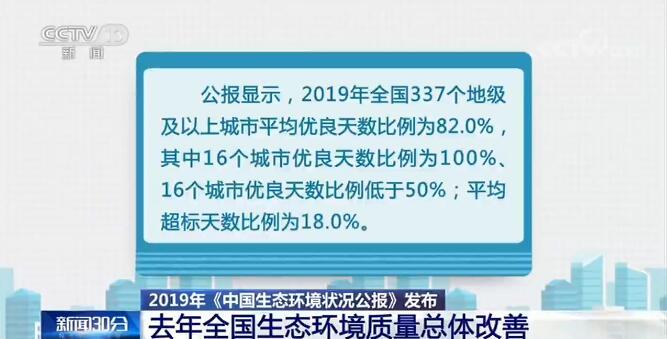 公报显示,2019年全国337个地级及以上城市平均优良天数比例为82.0%,其中16个城市优良天数比例为100%、16个城市优良天数比例低于50%;平均超标天数比例为18.0%。