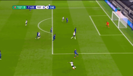 第35分钟,贝尔温边路横传,拉梅拉禁区内得球转身小角度低射,门迪站位不错用脚将球挡出。